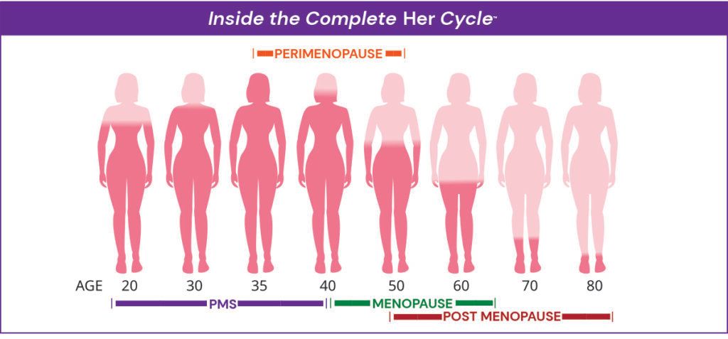 This stage of a woman’s cycle begins when hormones start to decrease. PMS symptoms may still be present but additional symptoms like hot flashes, night sweats and nervousness may also appear. These hormone changes can occur as early as a woman’s 30s and continue into her 50s. It is not uncommon to have to deal with PMS and perimenopause symptoms at the same time.