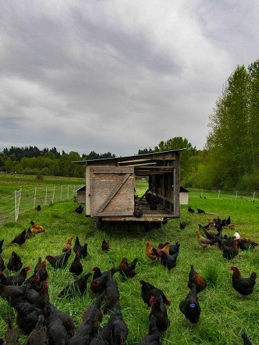 No matter what hierarchy has been adopted among them, they are all treated to certified organic Scratch and Peck feed that is milled locally in Burlington, Washington. Rawley ferments their feed in water for 3 days, creating a chicken-approved probiotic potion that increases digestion and nutrient bioavailability, plus raises its protein content. The added water also keeps his hens hydrated during hot summer days.