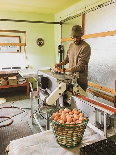 We finally make our way indoors and Rawley shows us his ancient egg-cleaning machine, straight out of a time warp. This thing looked like it was the first “machine” ever invented, but it still continues to handle cleaning around 125,000 eggs a year like a champ. On average, a great laying hen will produce one egg per day, year-round, but even the best egg layers typically slow down production in the winter, laying no more than 250 eggs a year