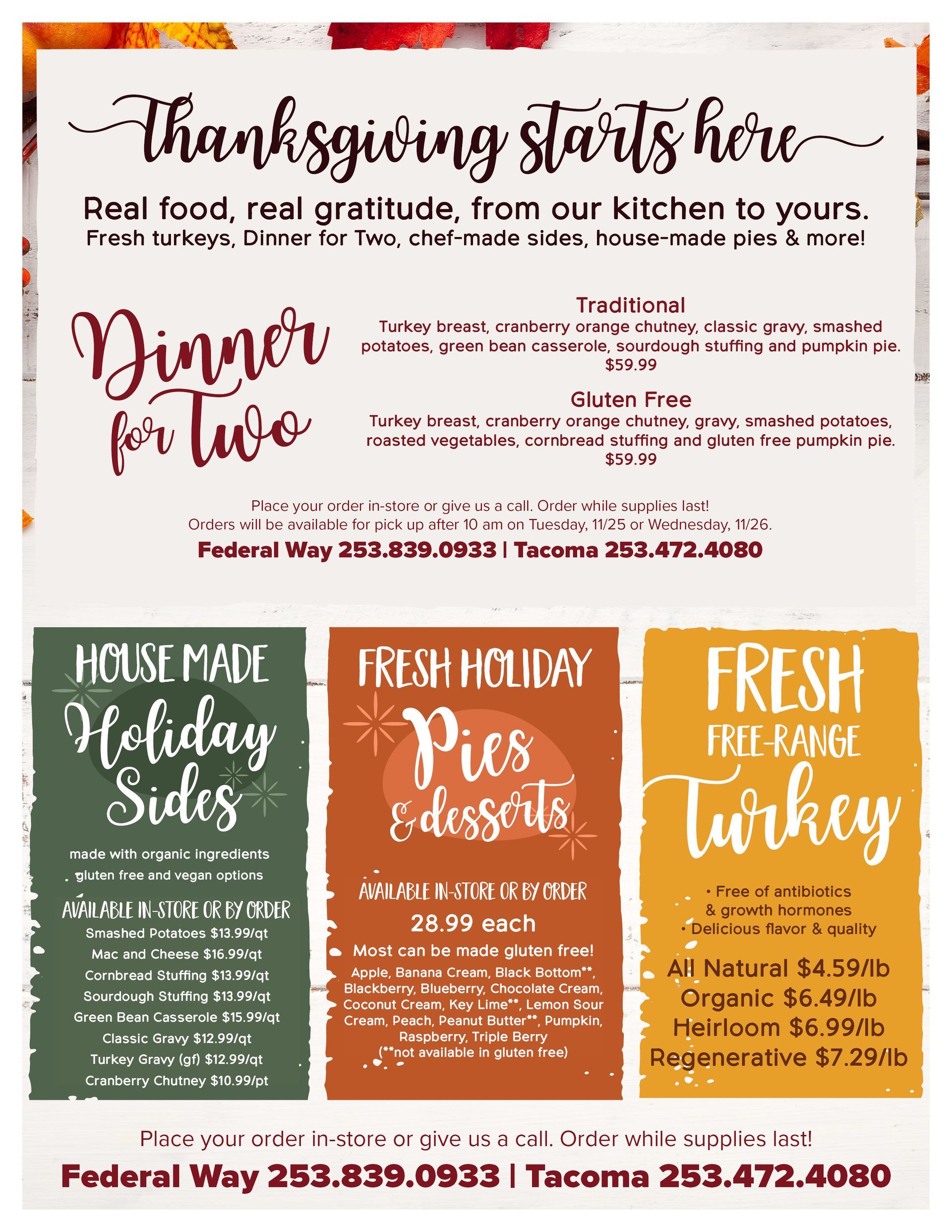 Order in-store or by phone starting October 28. Pick-up begins after 10 a.m. on Tuesday, November 25 or Wednesday, November 26.