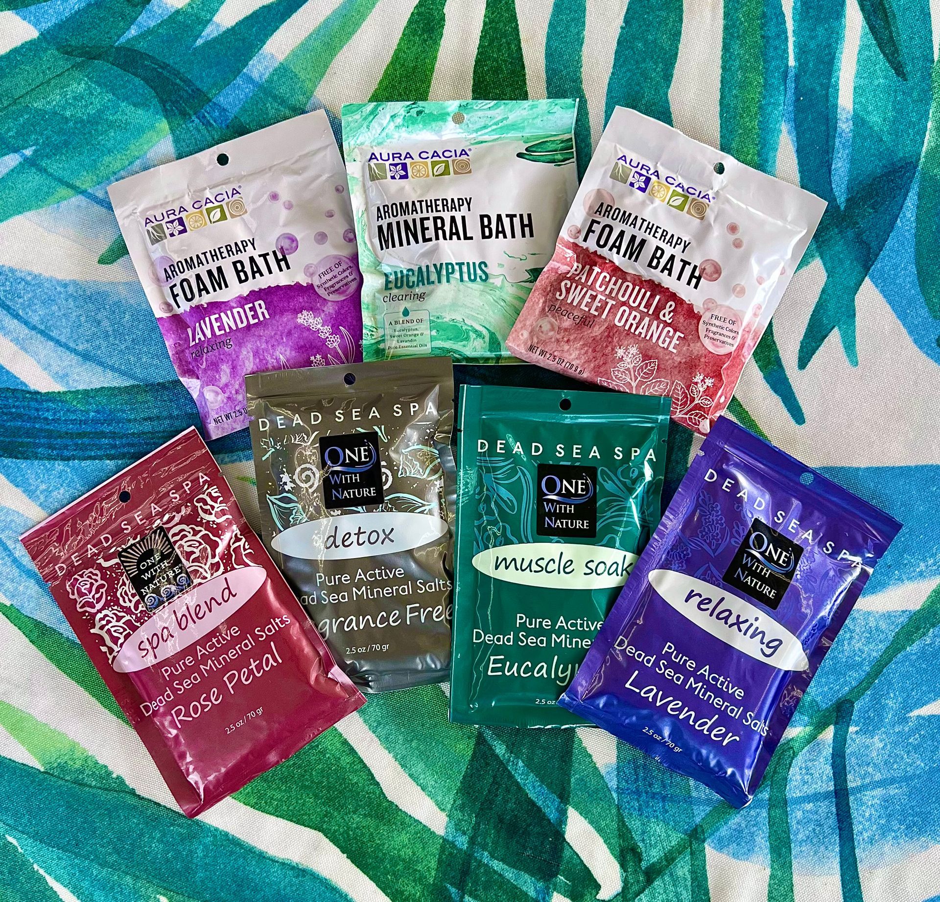 If you’ve got a bathtub at your destination, you’ve got the potential for a relaxing, rejuvenating and restorative soak with single-use Aura Cacia Aromatherapy Mineral, Foam or Fizzy Bath or One With Nature’s Dead Sea Mineral Salts! Both lines come in a variety of essential oil blends for a range of pleasant scents and therapeutic effects.