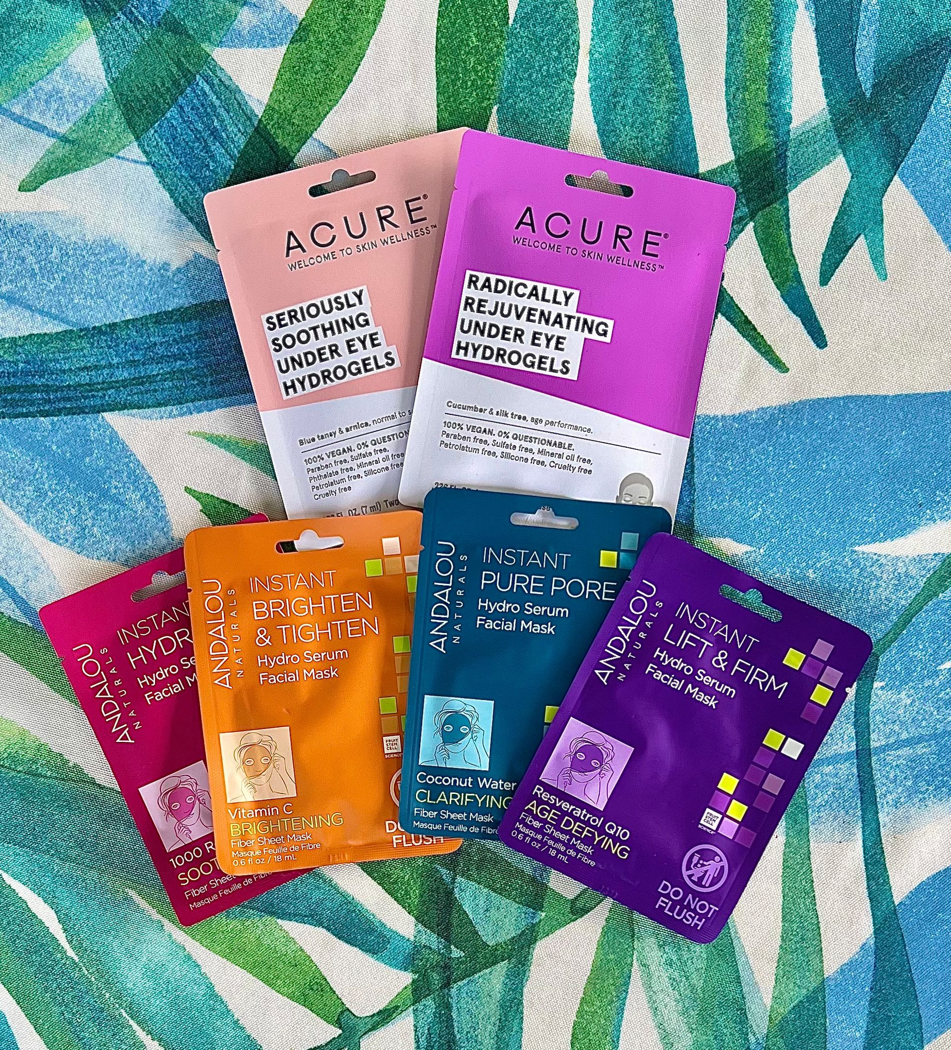 Is your skin feeling a little dehydrated after your long flight? And whose puffy eyes are those? Well, you can be fresh and dewy with a quick session in a Hydro Serum Facial Mask by Andalou, and address those dry, tired and puffy eyes with Under Eye Hydrogels by Acure!