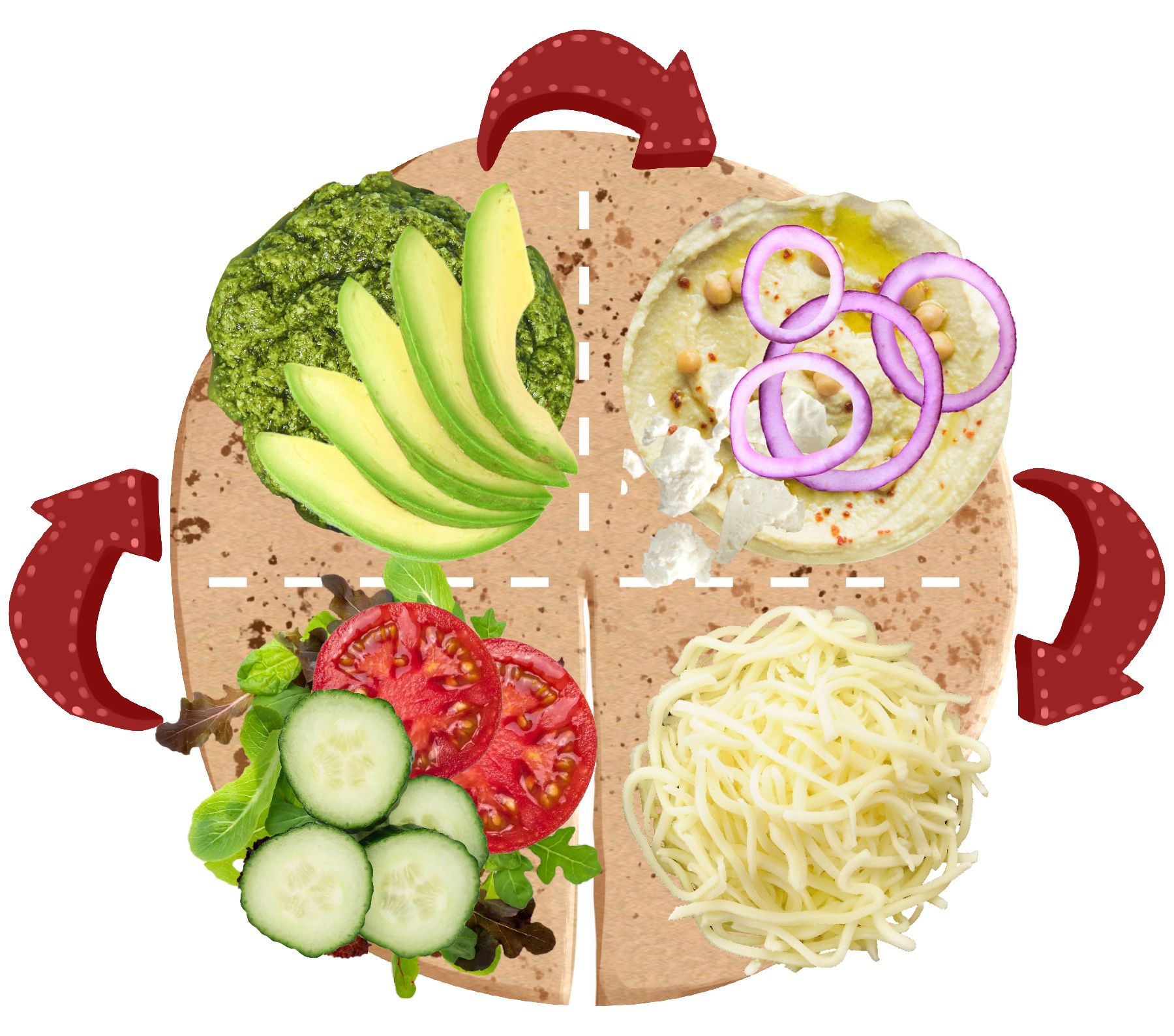 3. Fill the top-right quadrant with 1 Tbl hummus, red onion and feta.
